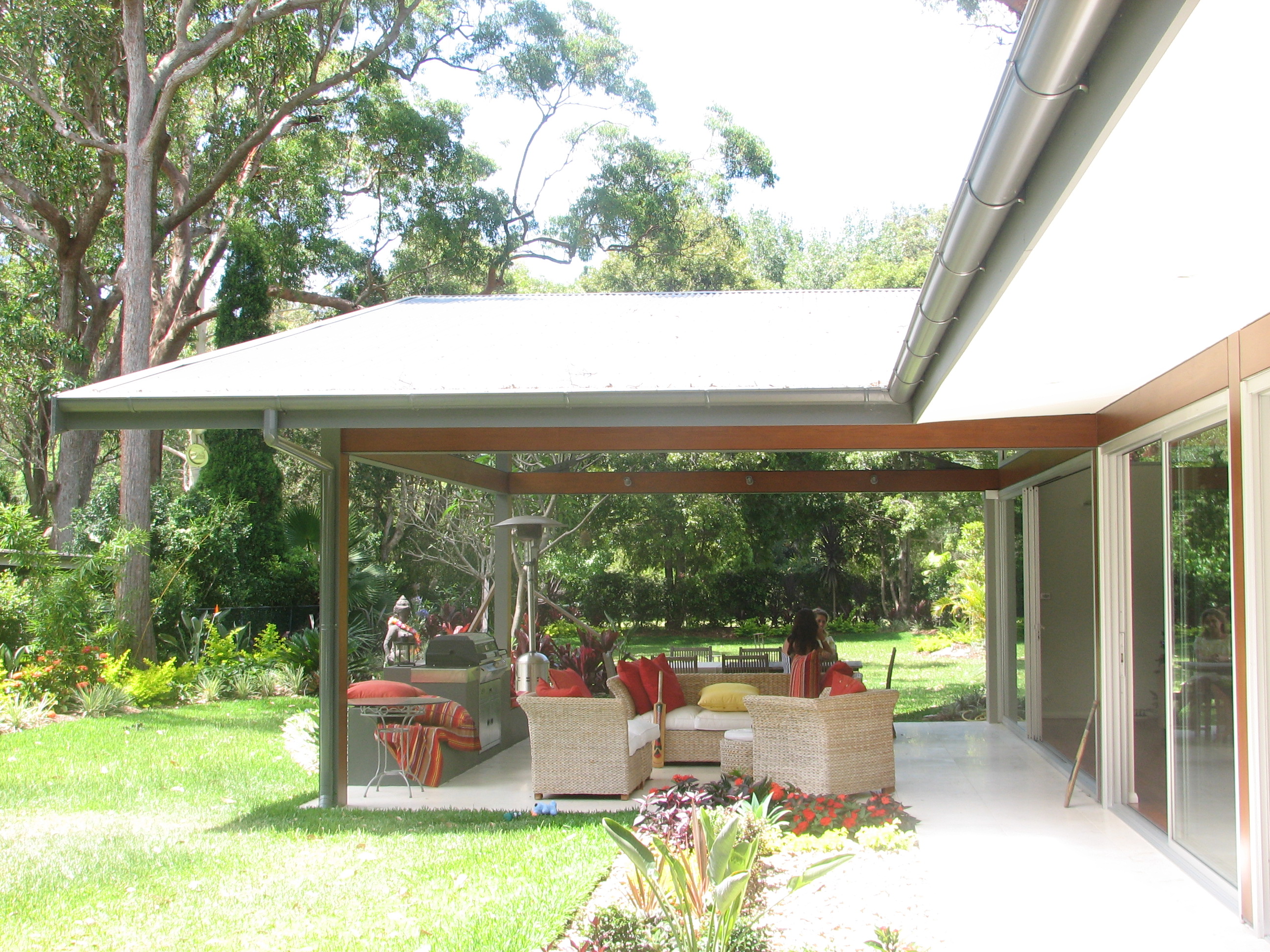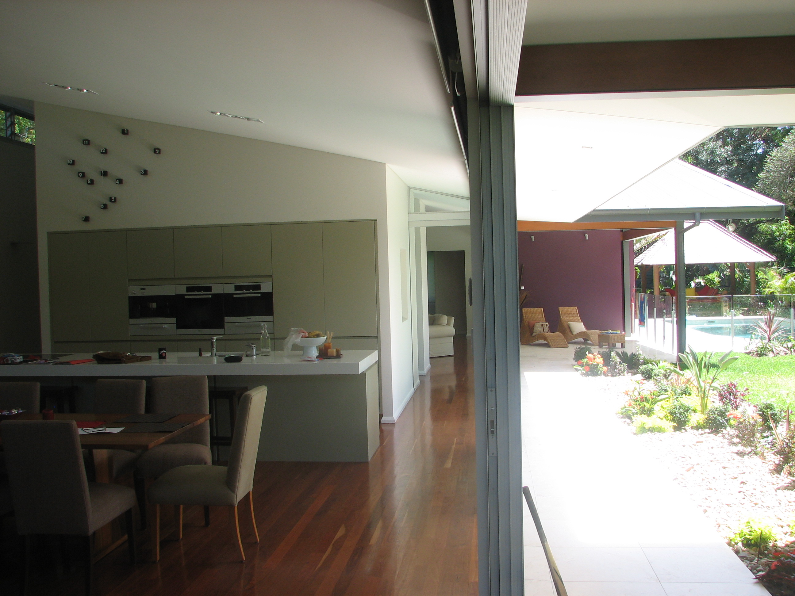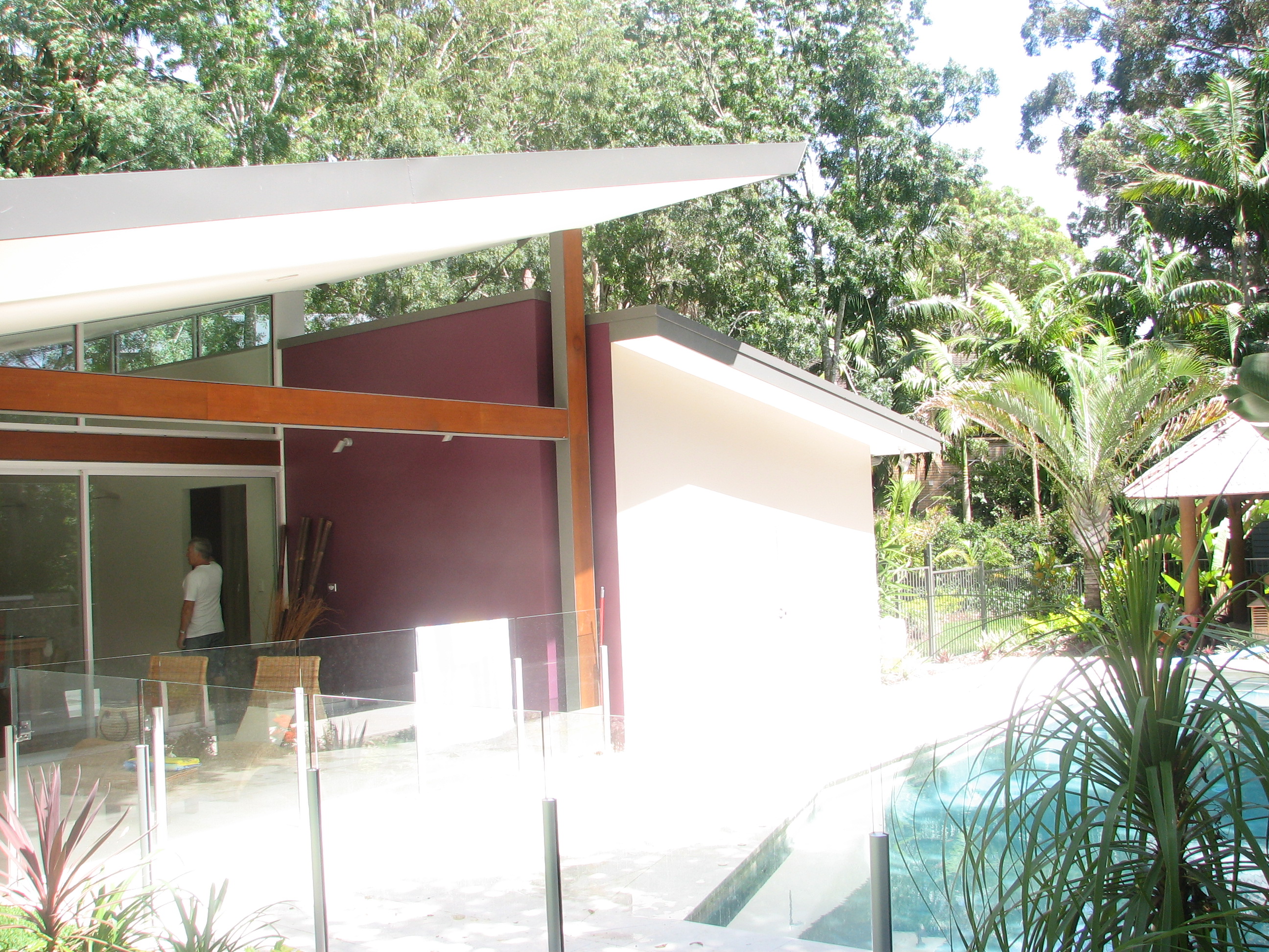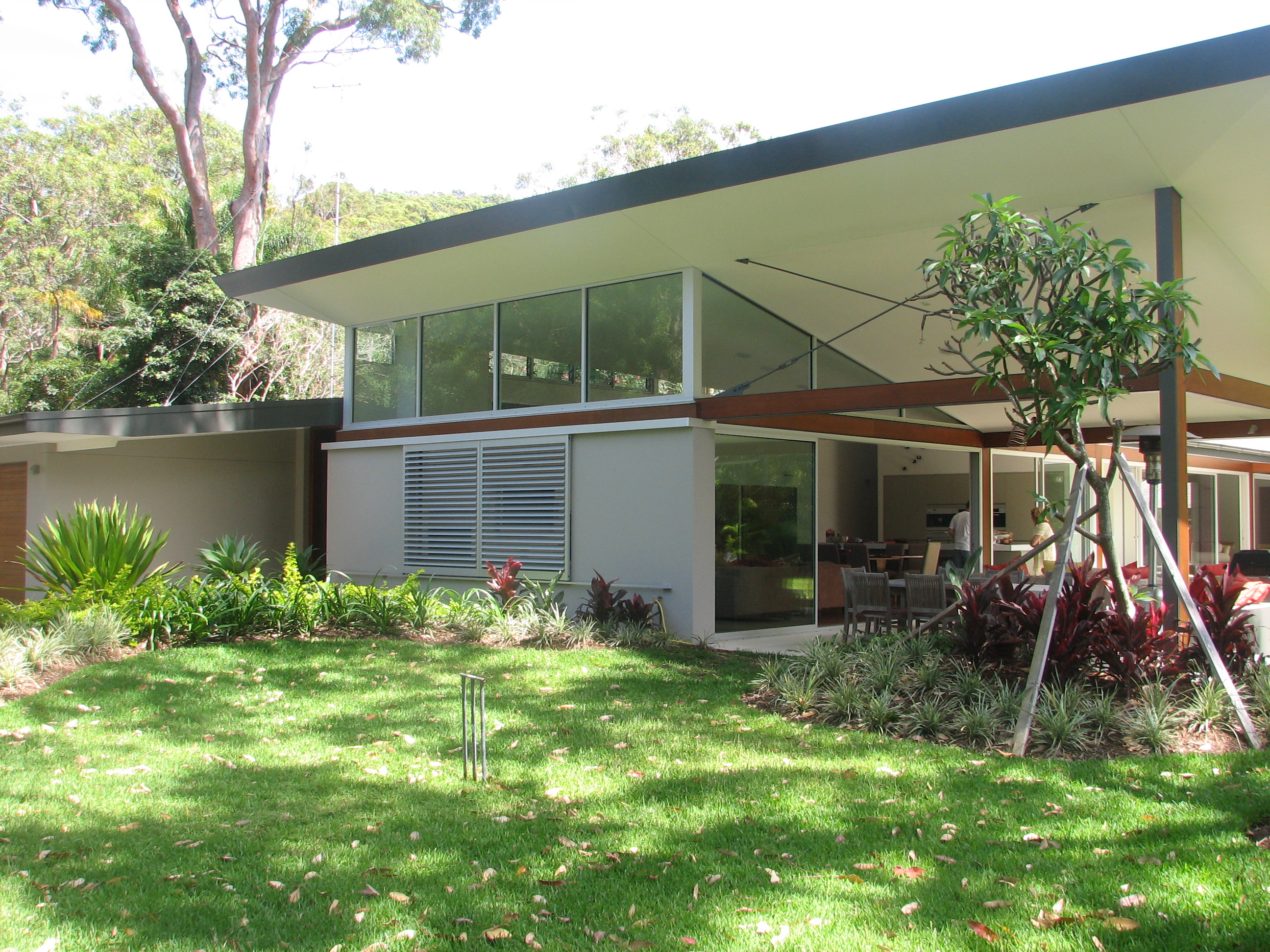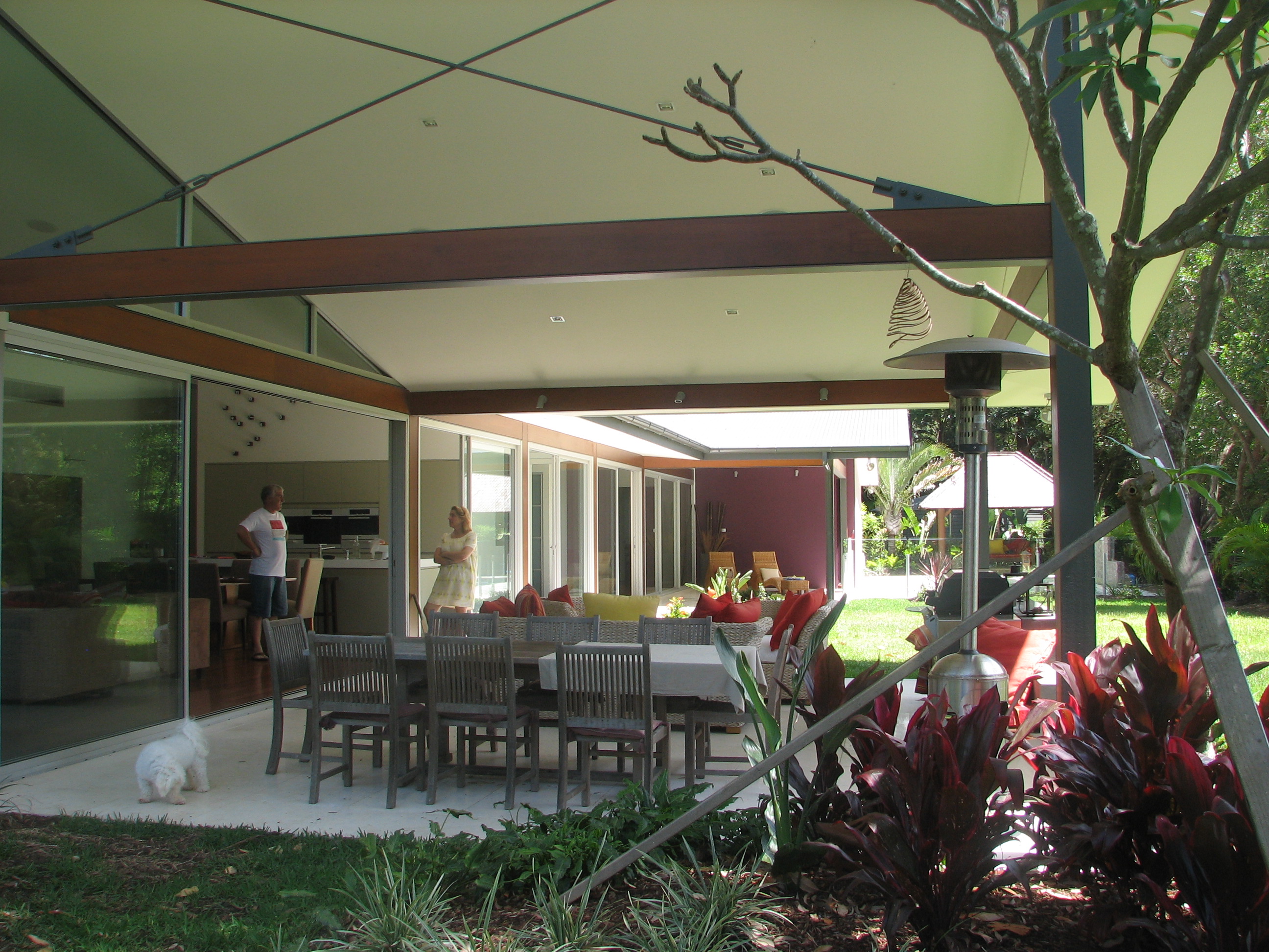 The house has an open floor plan with sweeping roof lines extending out over a large outdoor living area. All living and recreation spaces open to the north with the high ceilings adding ample cross ventilation in summer.