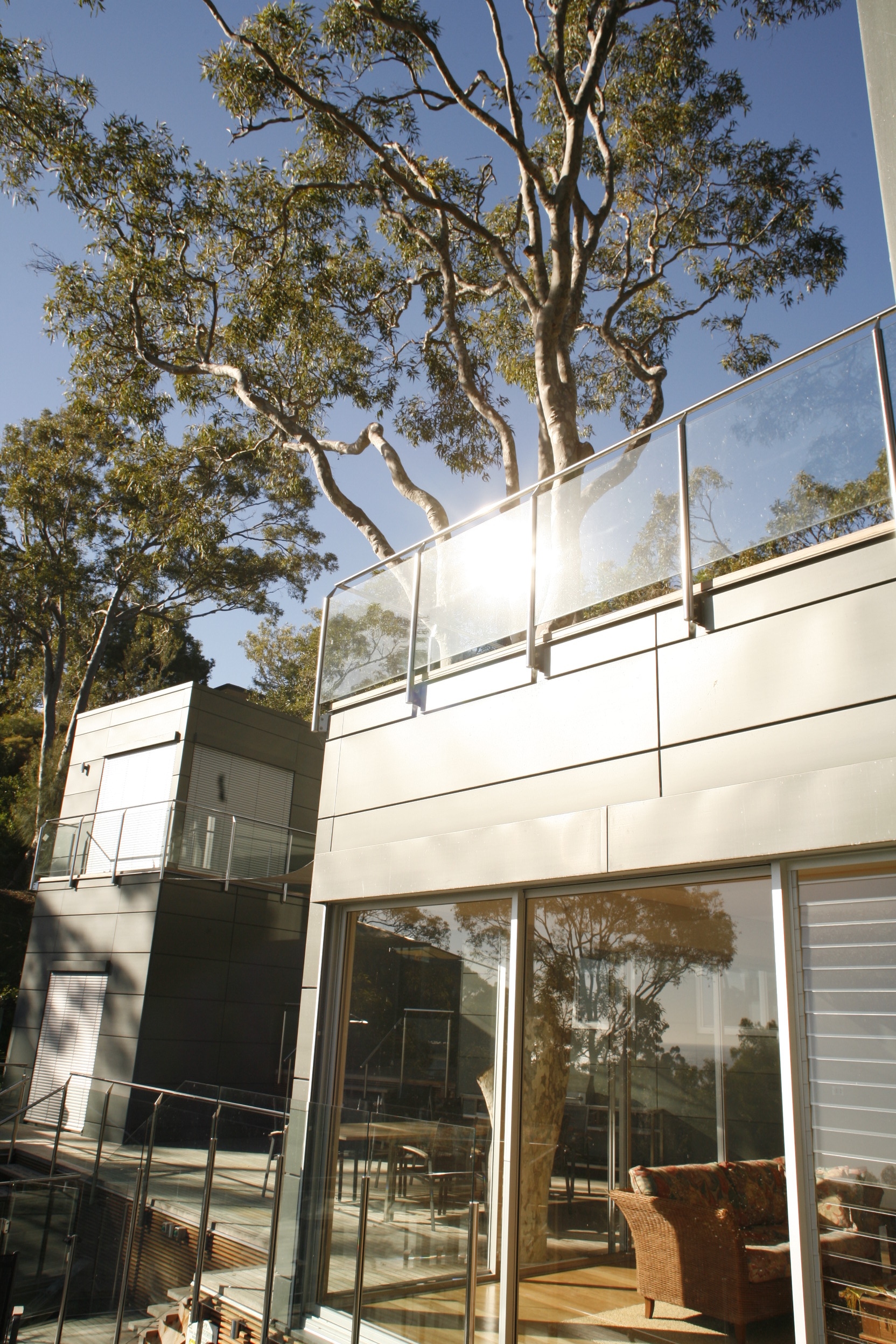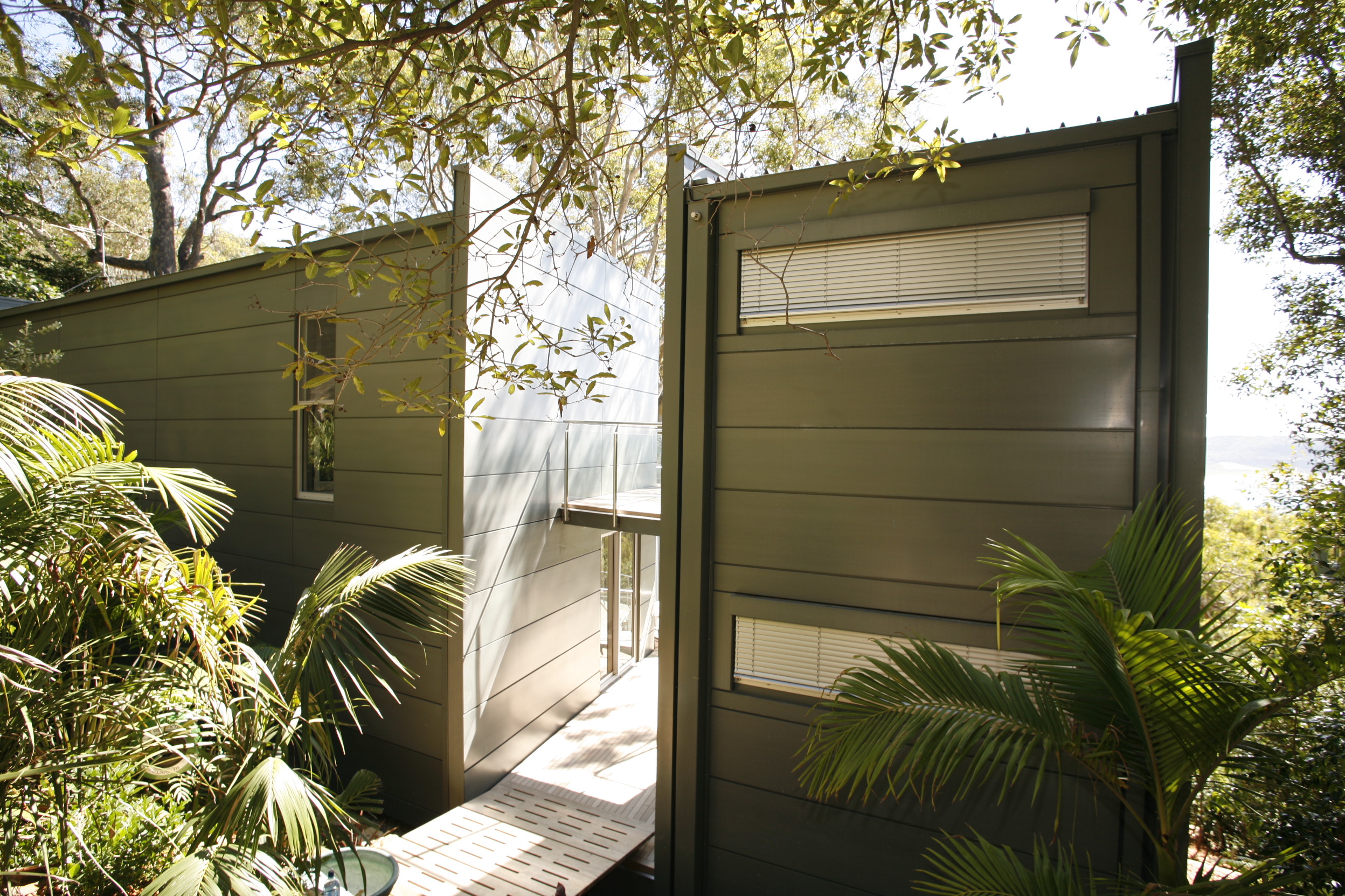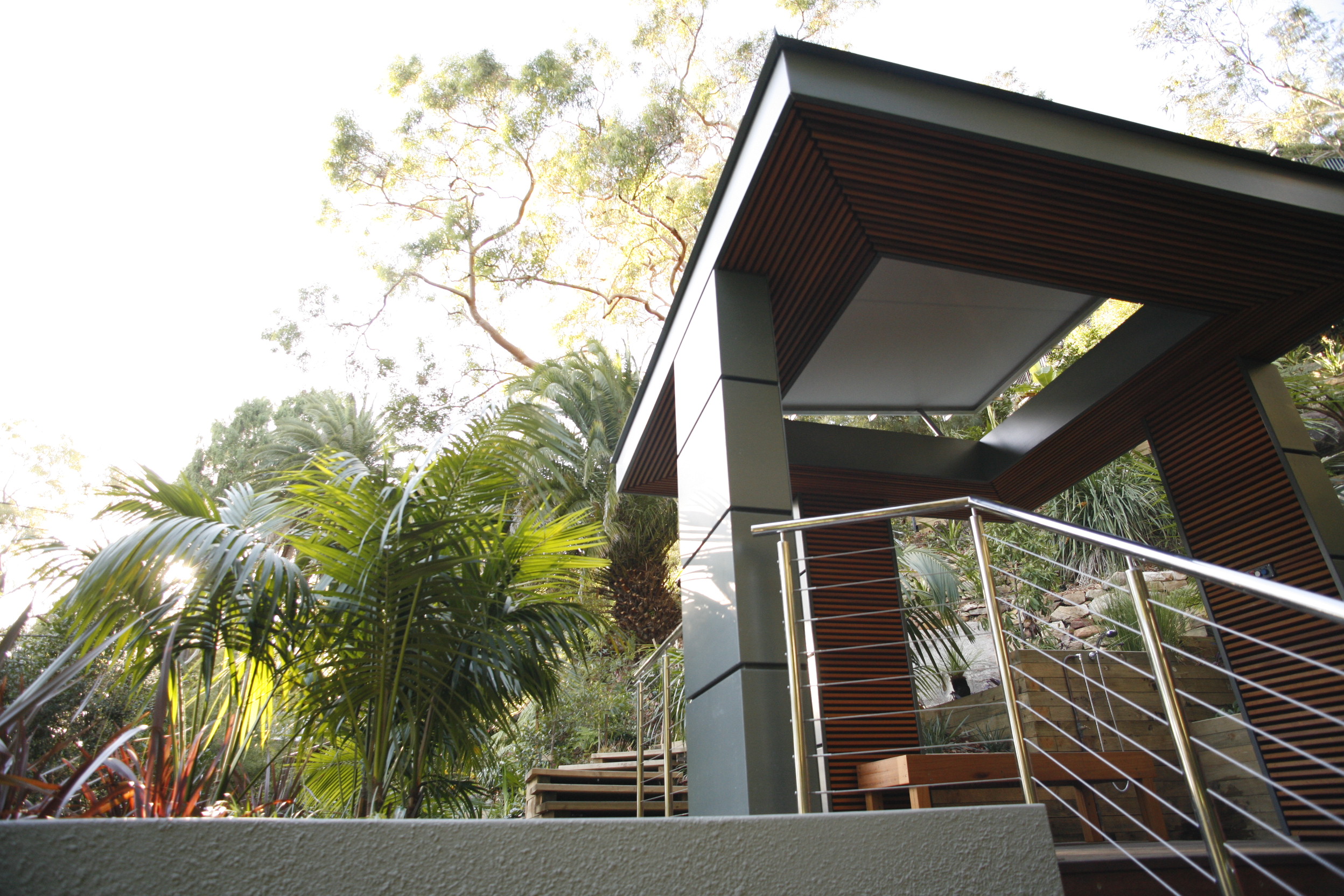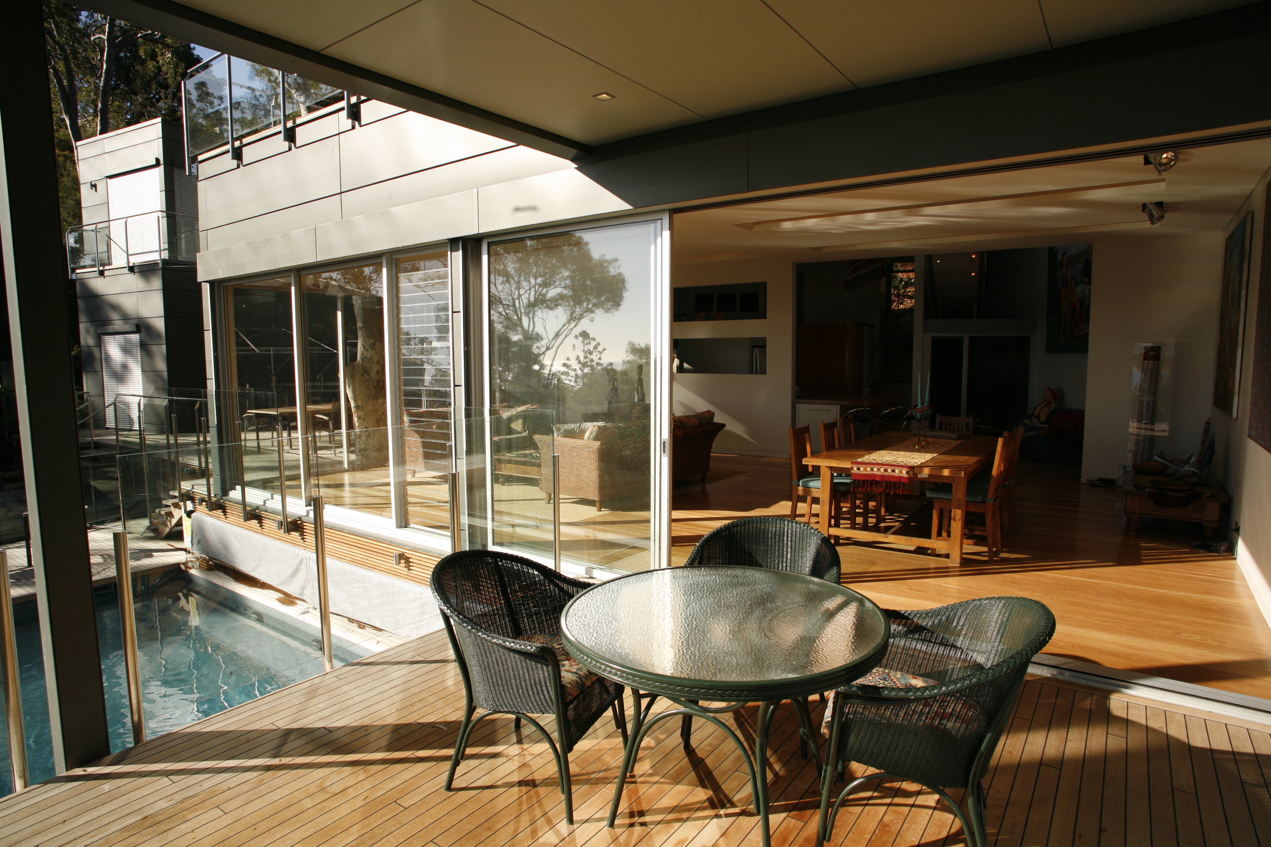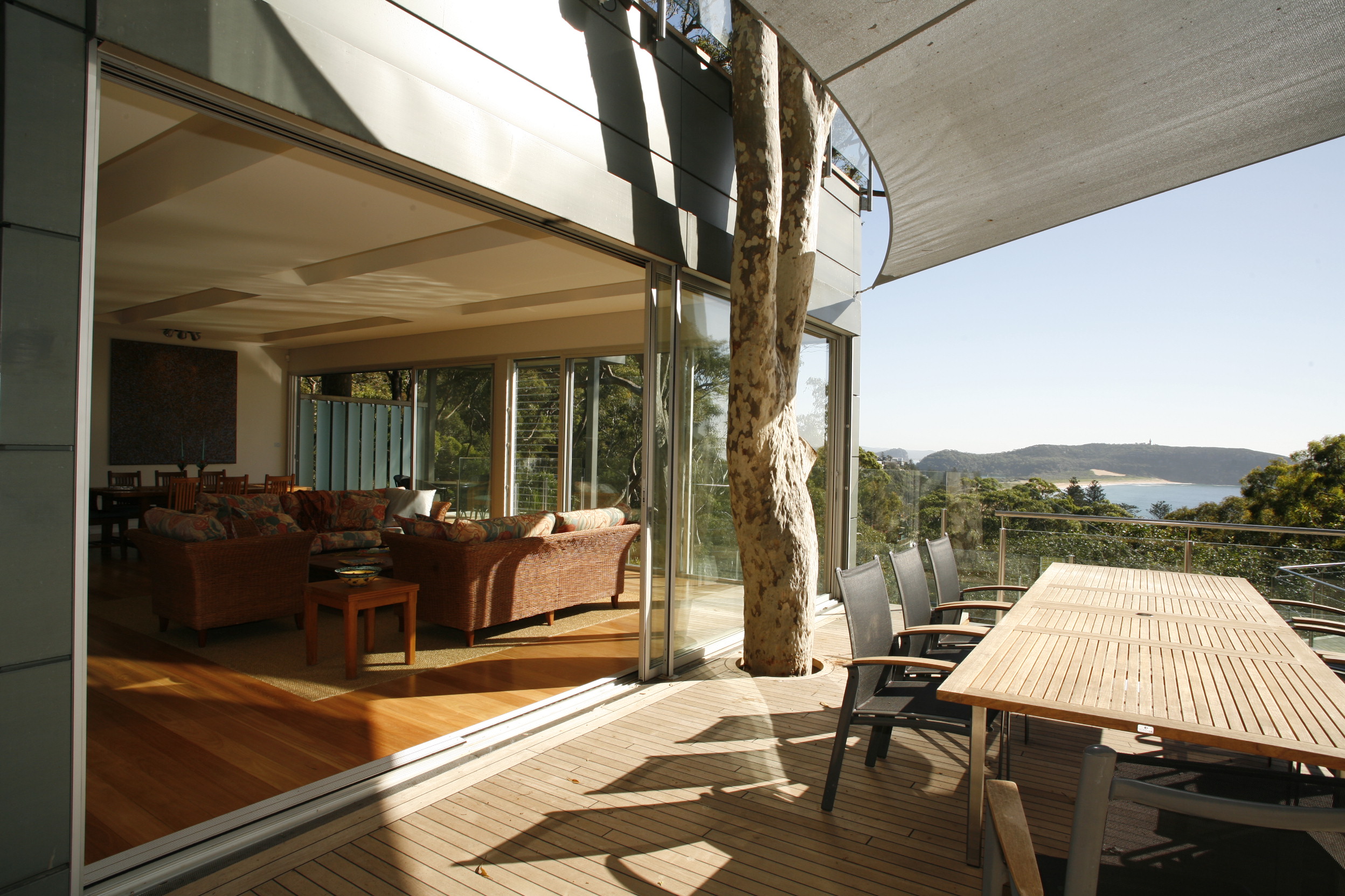 The graphite zinc wall cladding and sun bleached teak decks are a timeless natural blend with the native bush surrounds.